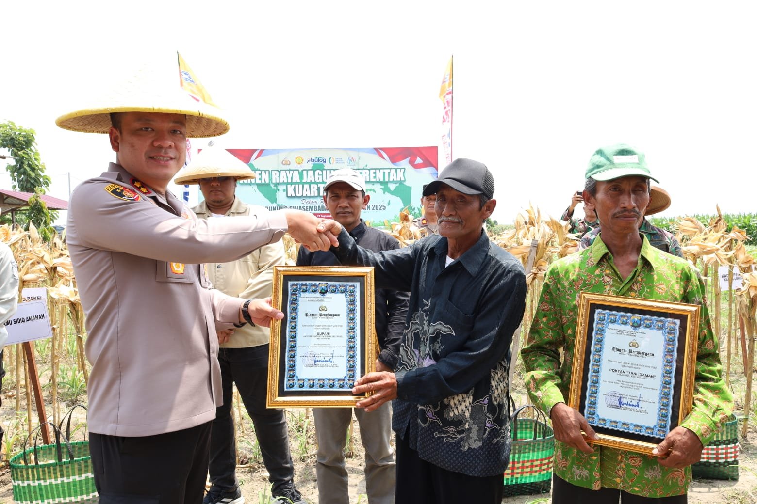 Kegiatan panen raya jagung serentak terpusat itu, Kapolres Tulungagung AKBP Muhammad Taat Resdi, Forkopimda, PJU Polres, Dari Bulog, Forkopimcam, Kades, Toga Tomas, Mahasiswa dan petani warga sekitar Sabtu (27/09/2025).
