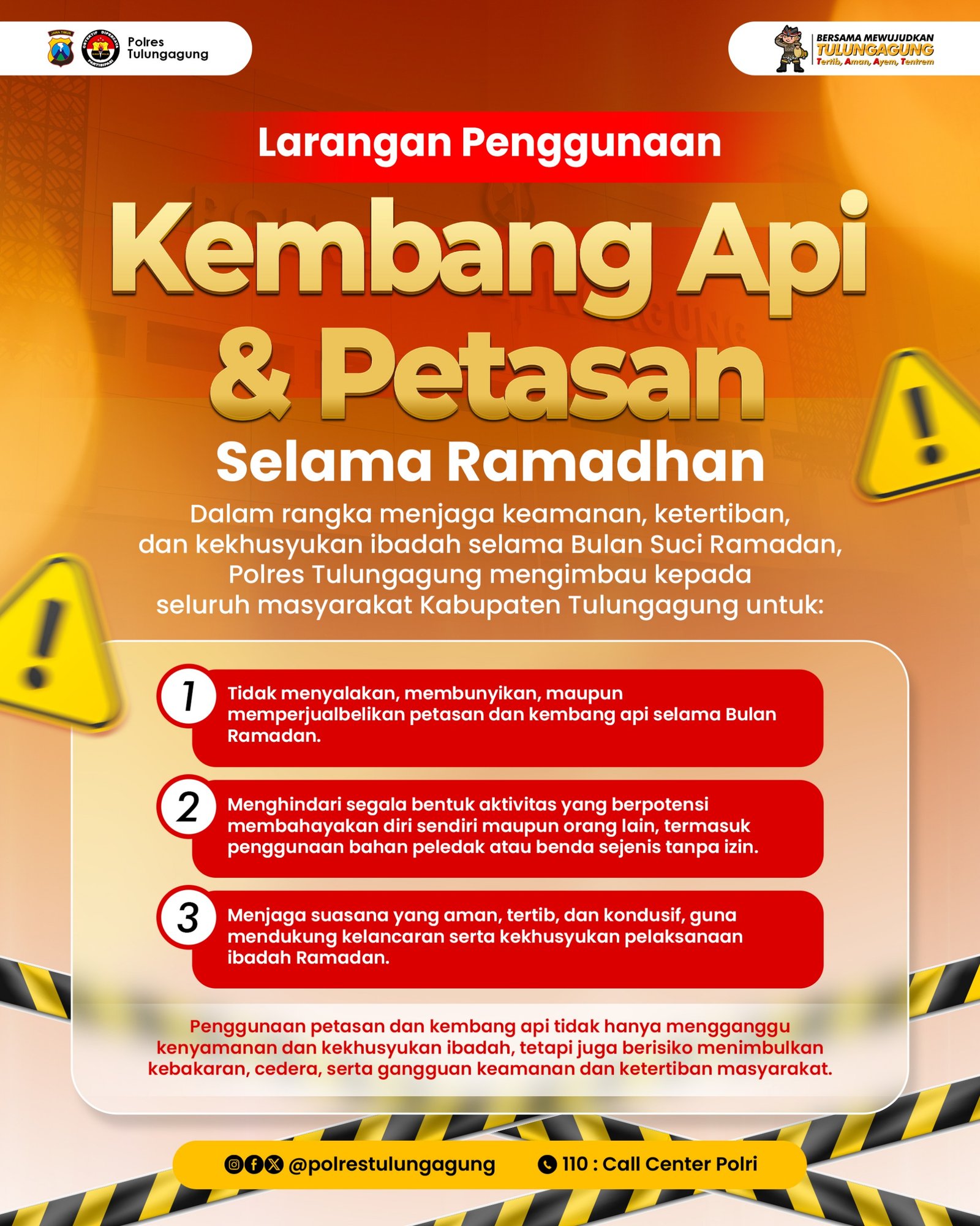 ๐ง๐๐น๐๐ป๐ด๐ฎ๐ด๐๐ป๐ด, ๐๐ป๐ฑ๐ถ๐ธ๐ฎ๐ป๐ฒ๐๐.๐ฐ๐ผ๐บ โ Polres Tulungagung mengeluarkan imbauan kepada masyarakat agar tidak menyalakan maupun memperjualbelikan petasan dan kembang api selama bulan Ramadhan 1447 Hijriah.