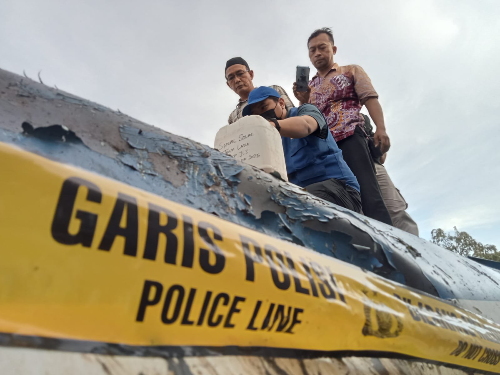 ๐ง๐๐น๐๐ป๐ด๐ฎ๐ด๐๐ป๐ด, ๐๐ป๐ฑ๐ถ๐ธ๐ฎ๐ป๐ฒ๐๐.๐ฐ๐ผ๐บ โ Satreskrim Polres Tulungagung mengambil sampel solar dari truk tangki yang terguling di Jalur Lintas Selatan (JLS), Desa/Kecamatan Besuki, Jumat (28/11/2025). Pengambilan sampel dilakukan di tempat penyimpanan barang bukti kendaraan milik Satlantas Polres Tulungagung di Desa Beji, Kecamatan Boyolangu.